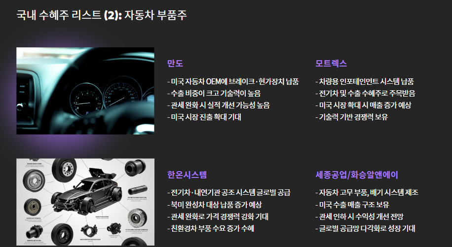 - 자동차 부품주: OEM 납품 확대, 미국 내 거래처 확대 → 실적 개선