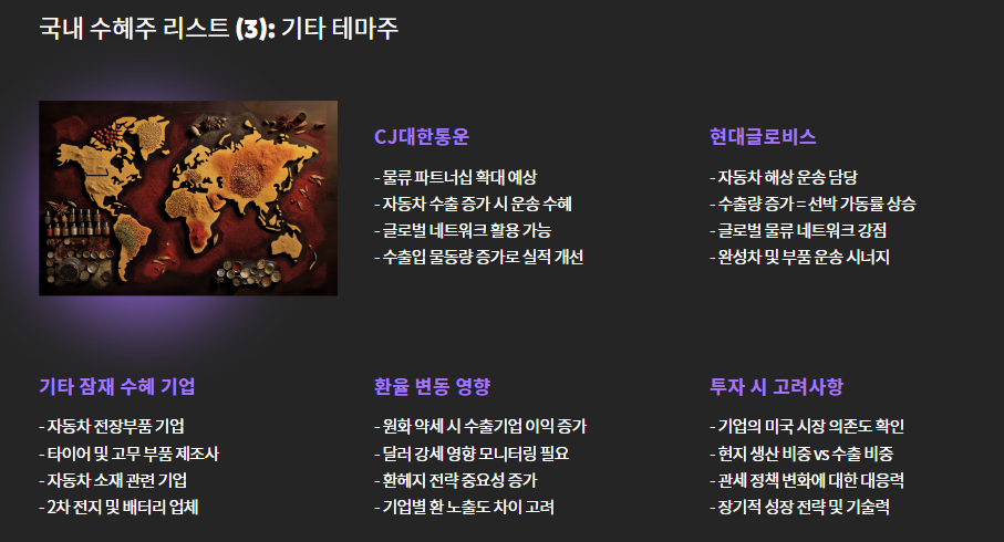 - 물류/해운 관련주: 자동차 수출 물량 증가에 따른 운송 수요 확대
