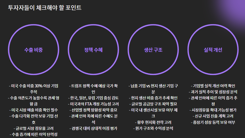 👉 특히 미국에 생산라인 없고 전량 수출하는 기업은 더 직접적인 수혜 예상!
