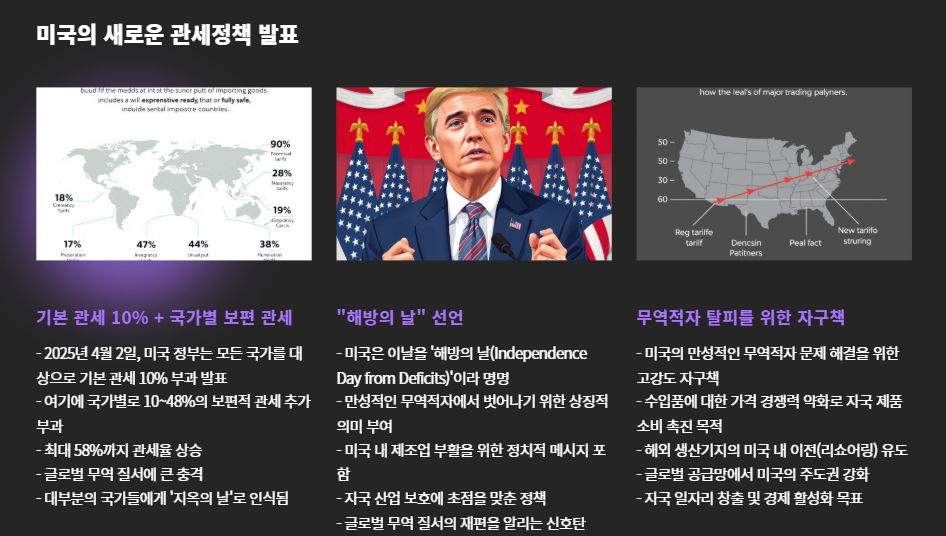 2025년 4월 2일, 미국 정부는 모든 국가를 대상으로 **기본 관세 10%**를 부과하고, 여기에 더해 **국가별 보편적 관세 10~48%**를 더하겠다고 선언했습니다.