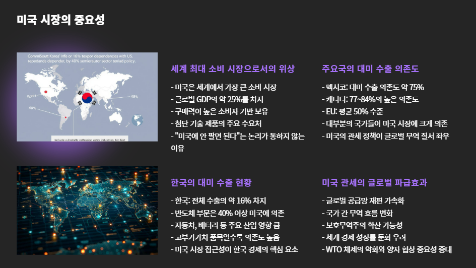 이처럼 미국에 대한 무역 의존도가 높기 때문에, 미국이 관세로 압박을 넣으면 전 세계가 흔들릴 수밖에 없습니다.
