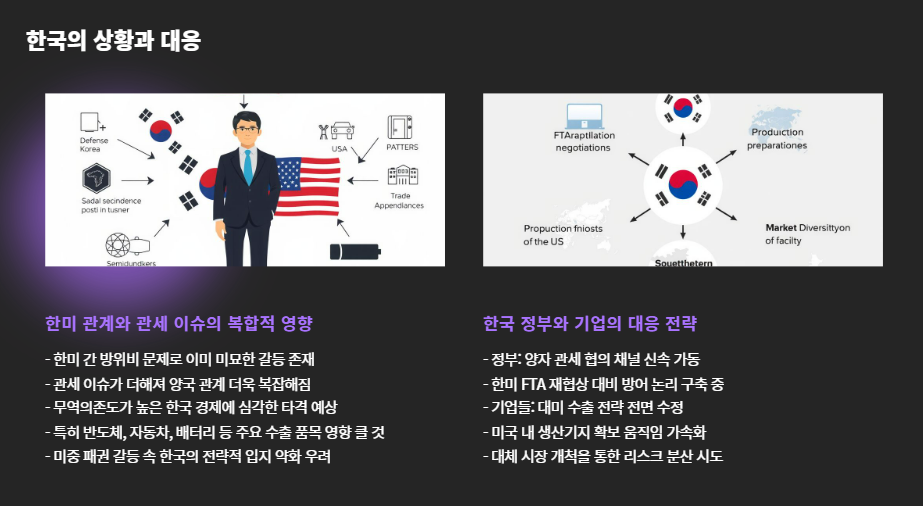 한미 간에는 방위비 문제로 이미 미묘한 갈등이 있는 가운데, 이번 관세 사안은 무역의존도가 높은 한국 경제에 매우 민감한 이슈로 작용합니다.