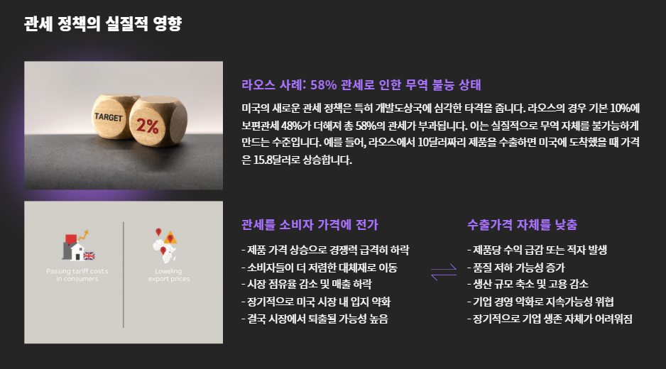 보편적 관세가 가장 높게 책정된 국가는 라오스로, 기본 10% + 보편관세 48%를 합쳐 총 58%의 관세가 부과됩니다.