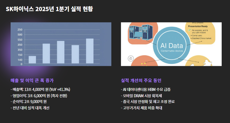 2025년 1분기 실적 발표에 따르면, SK하이닉스는 다음과 같은 주요 실적을 기록했습니다: