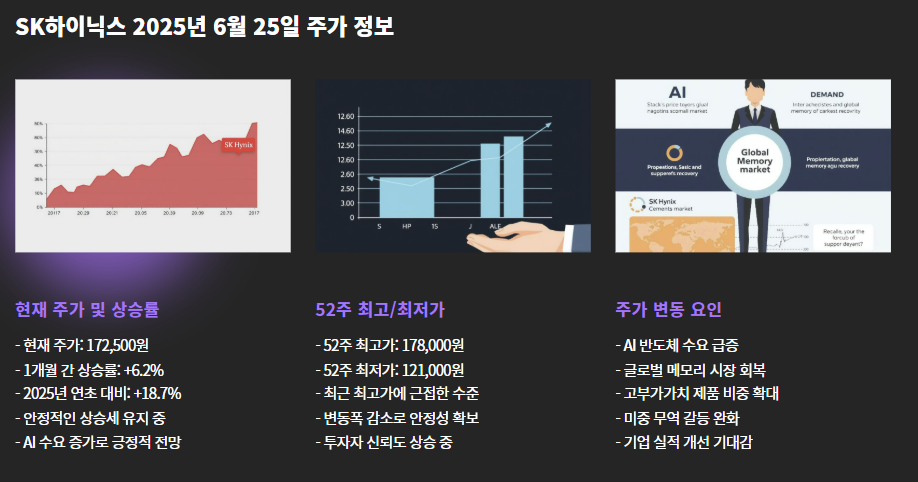 2025년 6월 25일 오전 11시 기준, SK하이닉스의 주가는 172,500원을 기록하고 있으며, 전일 대비 소폭 상승한 수치입니다. 최근 몇 주간의 흐름을 보면 다음과 같은 특징이 나타납니다:
