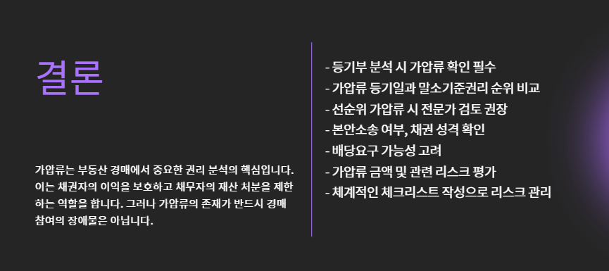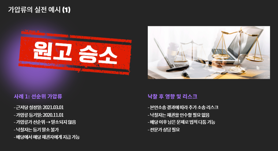 ✅ 가압류가 선순위일 경우 법률 전문가의 사전 검토 권장