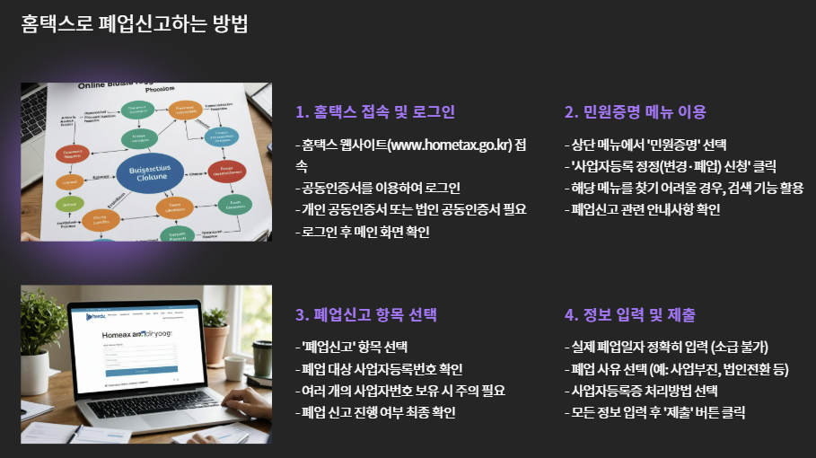 홈택스를 활용하면 폐업신고 자체는 간단하지만, 정산할 세금과 제출할 자료는 철저하게 준비해야 합니다.
