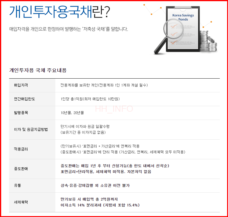 개인투자용 국채는 대한민국 정부가 발행하는 채권으로, 안정적인 이자 수익을 제공하는 금융상품입니다. 일반적으로 만기까지 보유할 경우 원금이 보장되며, 긴 만기 기간을 통해 높은 금리 혜택을 누릴 수 있습니다.