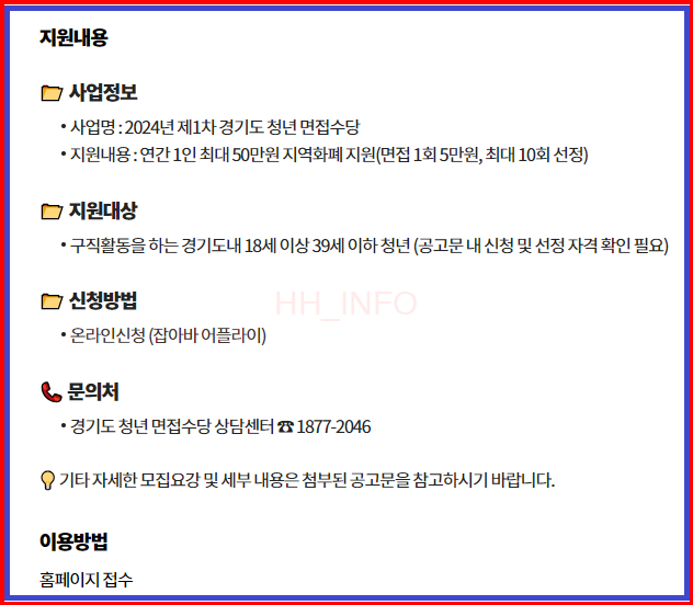 경기도 청년 면접수당은 취업을 위한 비용 부담을 덜어주는 중요한 혜택입니다. 필요한 서류를 준비하고 신청 절차를 따라 적극적으로 활용하여 청년 취업을 지원합시다.
