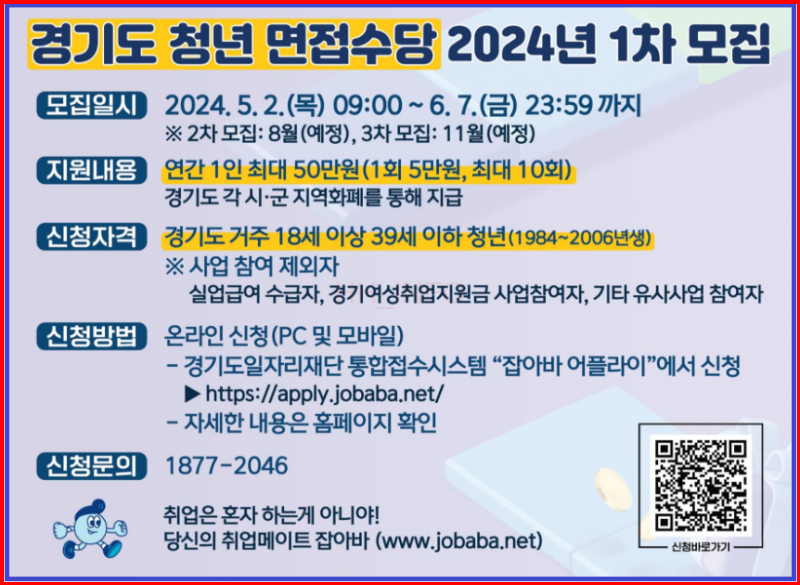 잡아바 어플라이 홈페이지를 통해 신청할 수 있으며, 문의 사항은 청년 면접수당 상담센터를 통해 확인할 수 있습니다.