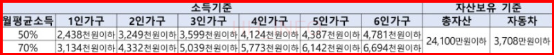 - 월평균소득 50% 이하 소득인정액 이하인 자