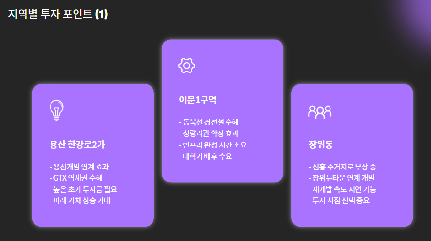| 이문1구역 | 동북선 수혜 + 청량리 생활권 | 인프라 완성까지 시간 필요 |