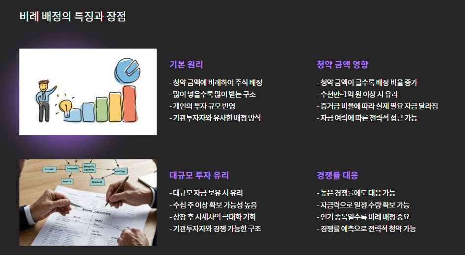 | 특징 | 적은 돈으로도 최소 1주 기대 가능 | 고액 청약자에게 유리 |