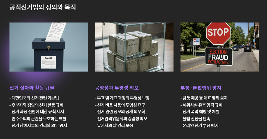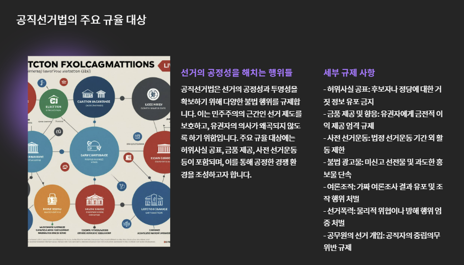 공직선거법은 대한민국의 선거 절차와 후보자·정당의 활동을 규율하는 법률입니다.