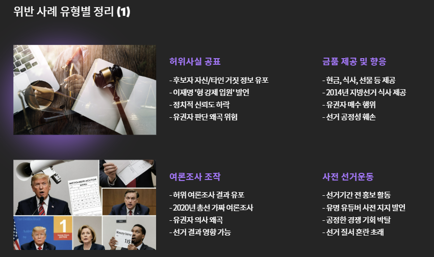 | 여론조사 조작 | 허위 여론조사 결과 유포 또는 조작 참여 | 2020년 총선 관련 가짜 여론조사 보도 건 |