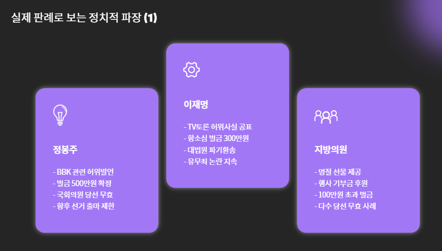 - 명절 선물 제공, 지역 행사 기부금 후원 등으로 100만 원 넘는 벌금 → 당선 무효