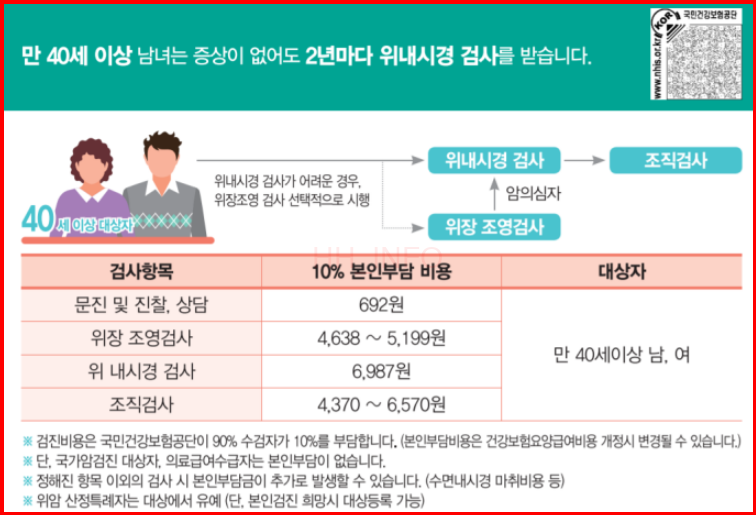 - 위암 검사: 만 40세 이상은 격년으로 위 내시경 검사를 받을 수 있으며, 본인 부담금은 약 6,987원입니다.