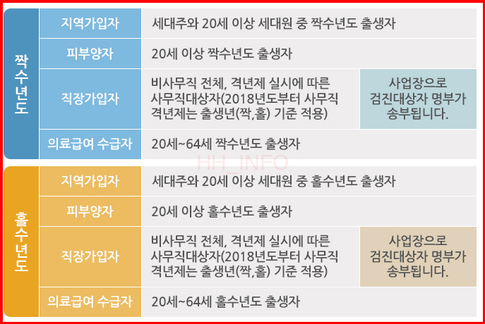 - 지역가입자 및 피부양자: 2년에 1회 건강검진 가능