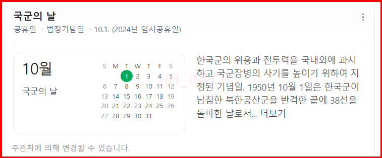 이상으로 2024년 국군의 날 임시공휴일 확정 소식을 전해드렸습니다. 다가오는 연휴 계획을 잘 세워보시고, 이번 기회를 통해 가족과 함께 의미 있는 시간을 보내시길 바랍니다.