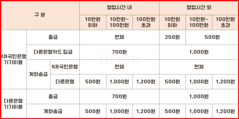 수수료는 은행 영업시간 내와 외에 따라 달라집니다. 영업시간 내 출금은 무료지만, 이후에는 10만원 이하 출금 시 250원, 그 이상은 500원의 수수료가 부과됩니다. 같은 은행끼리 송금 시에는 영업시간 외에도 수수료가 면제됩니다. 만약 다른 은행의 기기를 이용하면 700원의 수수료가 부과되며, 영업외 시간에는 1000원의 수수료가 부과됩니다. 계좌 송금은 금액별로 최대 1200원이 부과될 수 있습니다.