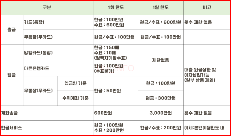 A2: 당행 카드와 통장을 이용하면 한 번에 현금 100만원, 수표 600만원까지, 하루 최대 600만원까지 출금 가능합니다.