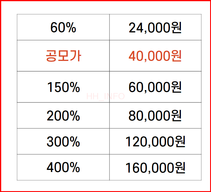 상장일 주가는 공모가의 60%에서 400%까지 변동할 수 있어요. 공모가가 4만원이니 24,000원에서 16만원까지 오를 수 있는 가능성이 있죠. 50% 정도 상승한다면 6만원 정도로 예상됩니다.