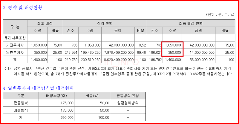 이번 공모주 청약은 우리사주조합 물량 없이 진행되었고, 기관투자자 105만주, 일반투자자 35만주를 모집했어요. 일반청약자는 균등과 비례로 각각 17만 5천주씩 배정받았답니다.
