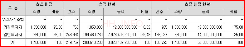 그리드위즈는 우리사주조합 배정 없이 기관투자자에게 75% (1,050,000주), 일반투자자에게 25% (350,000주)를 배정했습니다. 일반청약경쟁률은 569.89:1로 70% 확률로 균등 1주를 배정받을 수 있었고, 비례 1주 배정금액으로는 2,278만원이 필요한 청약이었답니다.