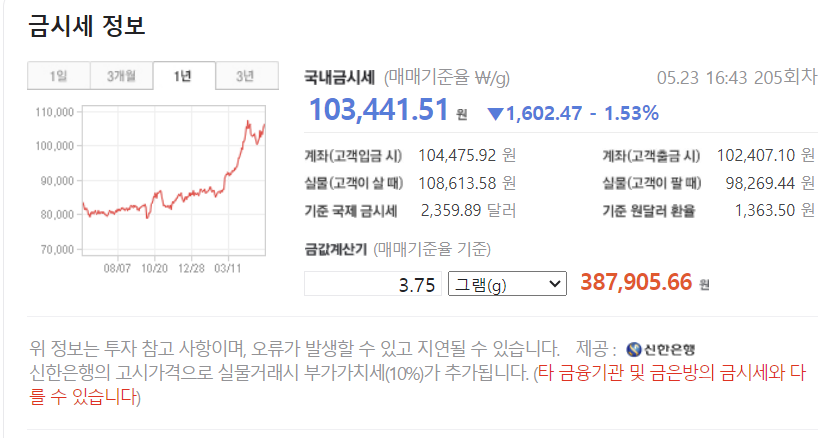 현재 한국 금값 시세는 5월 22일 기준으로 한돈(3.75g)당 397,582원입니다. 이는 부가세 10%가 미포함된 가격이기 때문에 살 때와 팔 때의 가격이 다릅니다. 살 때는 10% 정도 더 비싸게 구매해야 합니다. 최근에는 금값 최고치 경신에 따른 차익 실현 매도세가 증가하고 있습니다. 그러나 인플레이션은 자본주의 사회에서 장기적으로 발생하기 때문에 장기적인 관점에서 금에 투자하는 것도 나쁘지 않습니다. 물론 선택과 결과는 투자자 본인의 몫입니다.