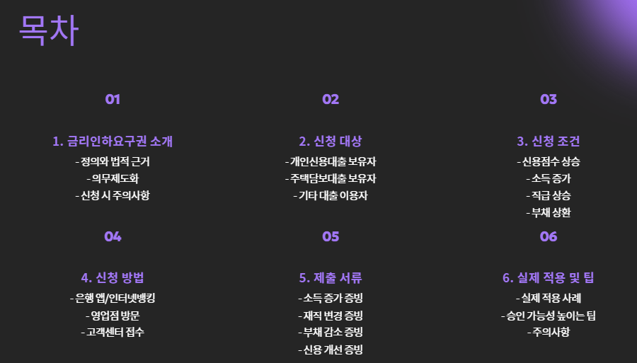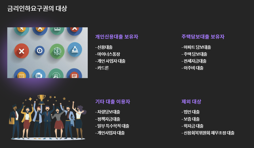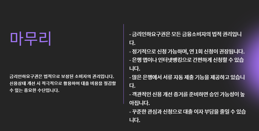 - 금리인하요구권은 법적으로 누구나 신청 가능한 권리입니다.