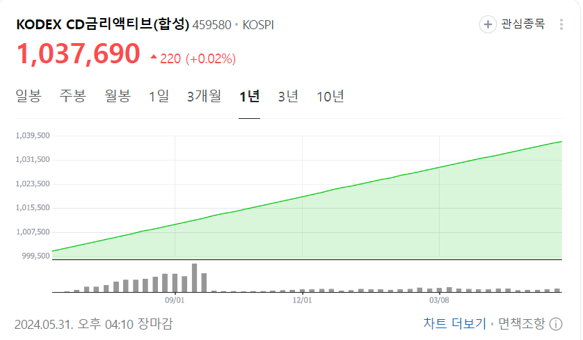 자산총액이 크기 때문에 두 상품 모두 거래가 원활합니다. 수수료와 비용을 비교해보면, Kodex CD 금리 액티브(합성)이 더 저렴합니다. 하지만 Kodex CD 금리 액티브(합성)은 1주당 금액이 100만 원 이상이기 때문에 최소 100만 원 이상의 자금이 필요합니다. 자금 상황에 맞게 선택하는 것을 추천드립니다.