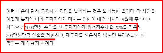 예를 들어, 1천만원의 수익이 발생하면 200만원이 원천징수되고 나머지 800만원만 재투자가 가능합니다. 원천징수된 금액을 돌려받기 위해서는 별도의 환급 신청을 해야 합니다.