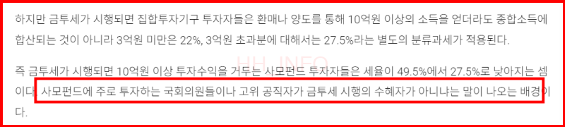 현재 사모펀드의 세율은 최대 **49.5%**에 달하지만, 금투세가 도입되면 **22%~27.5%**로 세율이 낮아집니다. 따라서 사모펀드 투자자들은 금투세로 인해 세금 부담이 절반 이하로 줄어드는 혜택을 보게 됩니다.