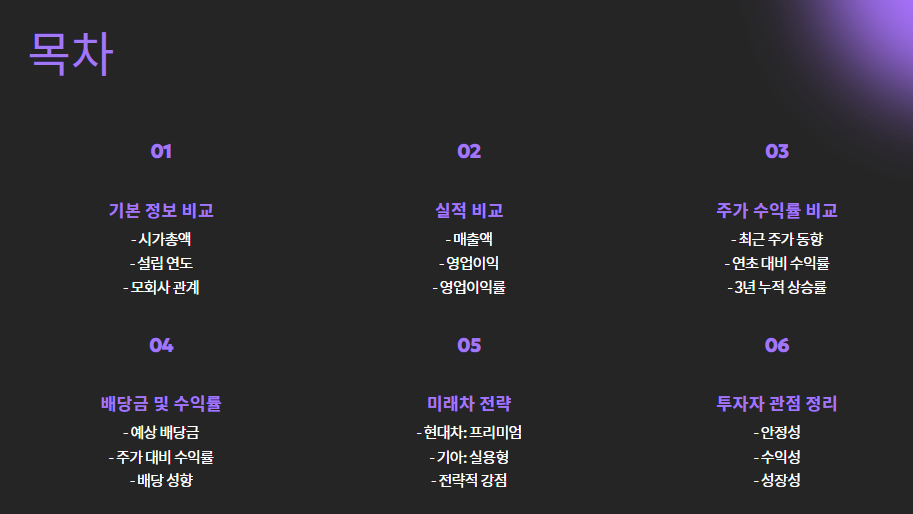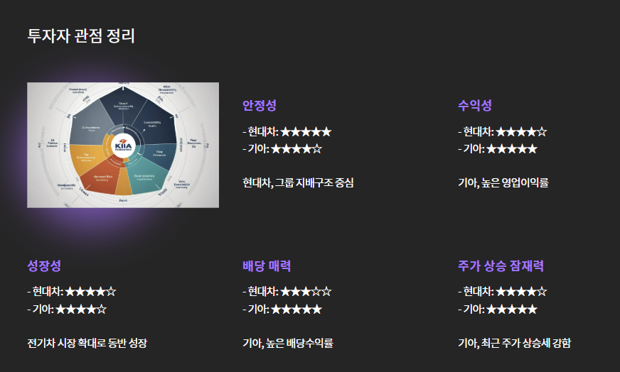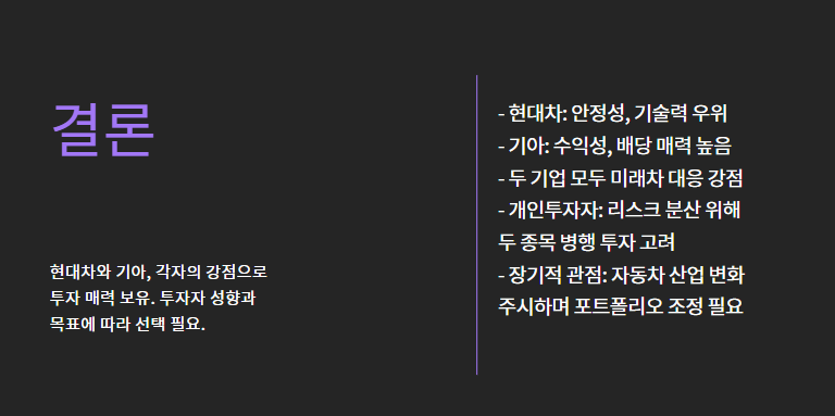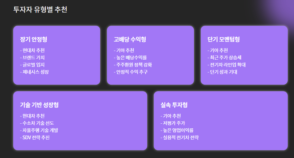 | 장기 투자 안정형 | 현대차 | 브랜드 가치 + 글로벌 입지 + 제네시스 성장 |