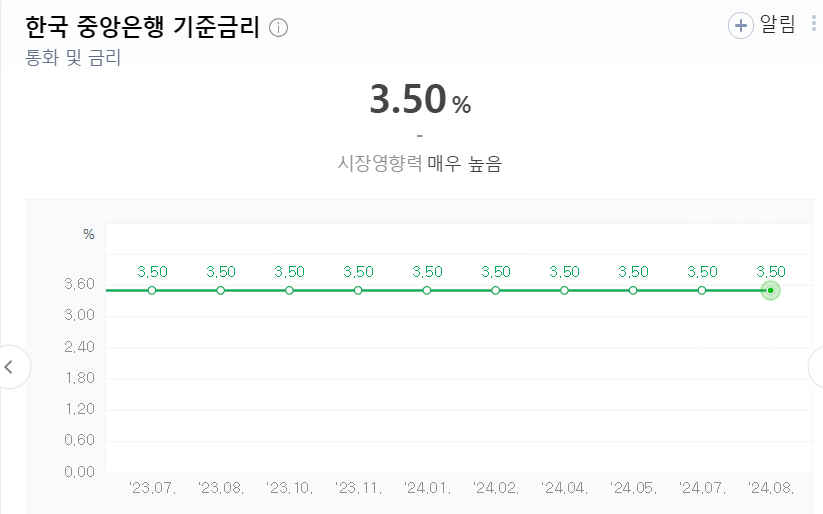 한국은행은 이번 회의에서 **3.5%**의 기준금리를 유지하기로 결정했습니다. 이는 2023년 1월 13일 이후 13회 연속 동결로, 역대 최장기간 동결 기록입니다. 2021년 8월 26일 처음으로 25BP 인상을 시작한 이후 2023년 1월까지 줄기차게 금리를 올려왔지만, 이후 1년 7개월이 넘는 기간 동안 동결 상태를 유지하고 있습니다.