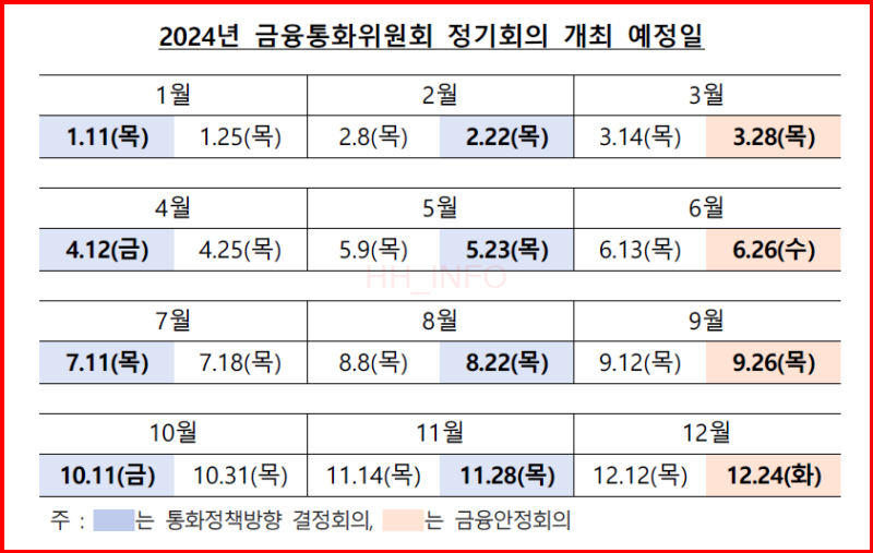 한국은행은 매년 8번의 통화정책회의를 통해 기준금리를 결정합니다. 이번 8월 22일 회의에서 금리 동결을 결정했으며, 앞으로 남은 회의 일정은 10월 11일과 11월 28일입니다. 각 회의 이후에는 결정문과 함께 기자 간담회 내용이 발표되며, 회의 디테일은 2주 뒤 공개되는 의사록에 명시됩니다.