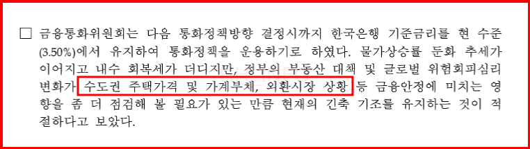 한국은행은 물가 안정과 내수 경기 둔화를 고려하여 금리를 인하해야 한다는 필요성을 인정하면서도, 수도권 주택가격 상승과 가계부채 문제로 인해 금리를 동결할 수밖에 없었다고 설명했습니다. 만약 금리를 인하하게 되면 부채 이자 부담이 줄어들어 대출 규모가 증가하고, 이는 결국 집값을 더 상승시키는 결과를 초래할 수 있기 때문입니다.