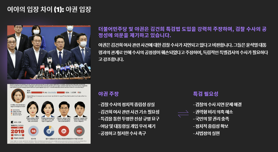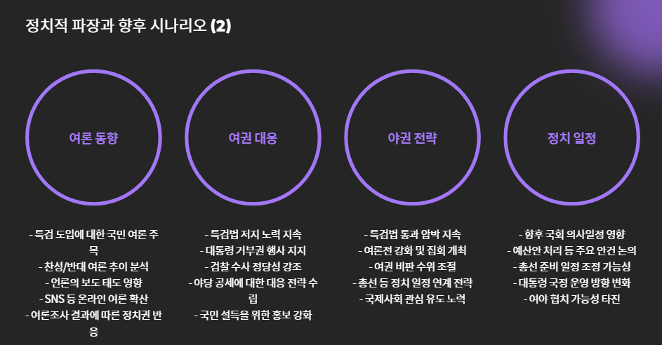 - 국민 여론이 특검 도입에 우호적일 경우, 여권은 방어적 입장