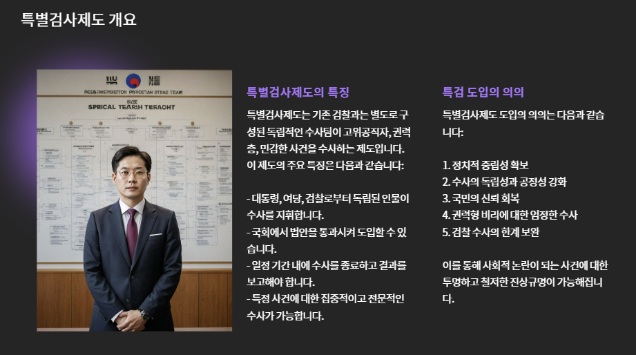 특별검사제도는 기존 검찰과는 별도의 수사팀을 구성해 고위공직자, 권력층, 민감한 사건을 독립적으로 수사하는 제도입니다.