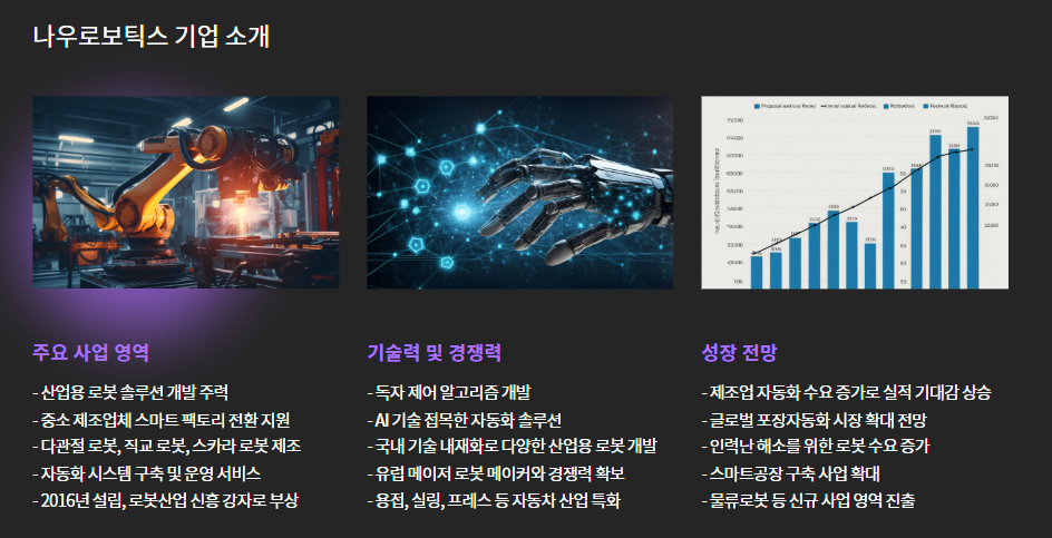 나우로보틱스는 산업용 로봇 솔루션 개발을 주력으로 하는 로봇 자동화 기업으로, 중소 제조업체의 스마트 팩토리 전환을 지원하는 기술력을 갖추고 있습니다.