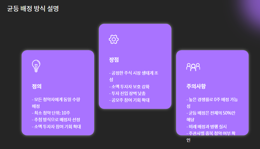 균등 배정은 모든 청약자에게 동일한 최소 단위 수량으로 공모주를 배정하는 방식입니다.