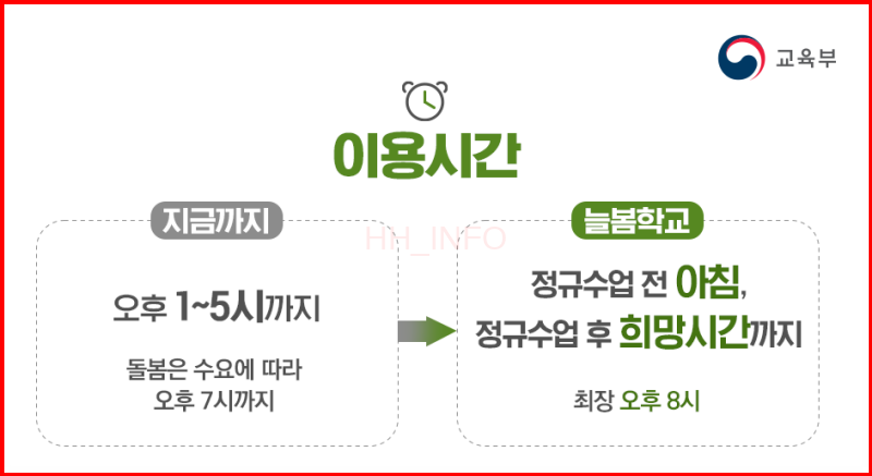 늘봄학교는 오전 7시부터 오후 8시까지 운영됩니다. 부모님이 출근 전 아이를 맡길 수 있고, 퇴근 후 데려갈 수 있는 시간까지 운영되기 때문에 맞벌이 가정에게 큰 도움이 됩니다.