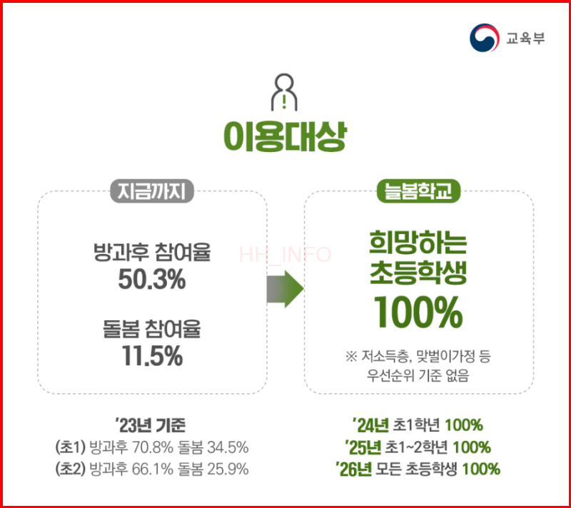 늘봄학교는 이러한 문제를 해결하고자 모든 초등학교 저학년 학생들에게 100% 참여 기회를 제공합니다. 2024년 2학기부터는 전국 모든 초등학교에서 1학년 학생들이 늘봄학교에 참여할 수 있습니다.