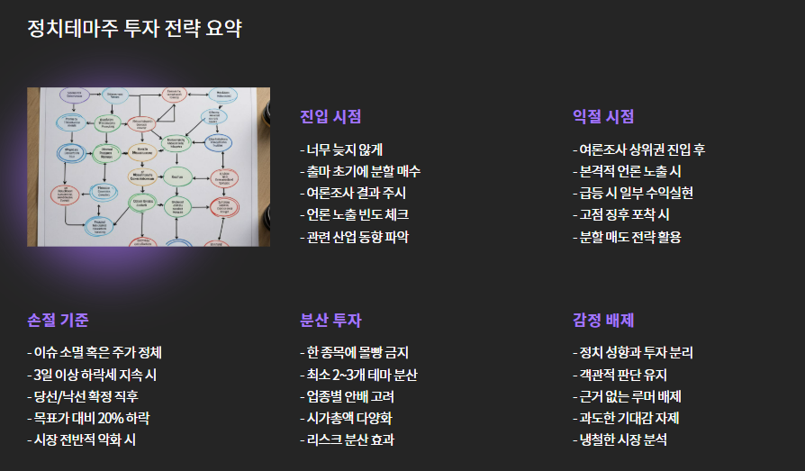| 익절 시점 | 여론조사 상위권 진입 후, 본격적 언론 노출 시 수익 실현 |