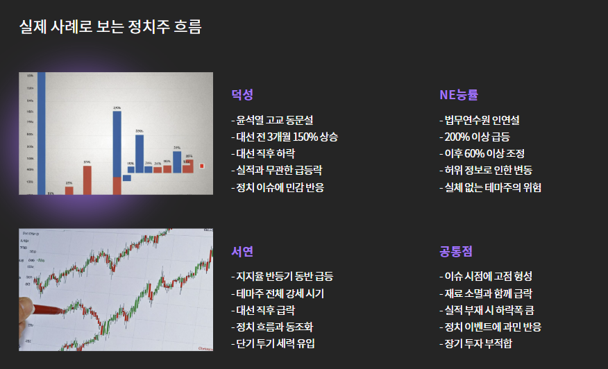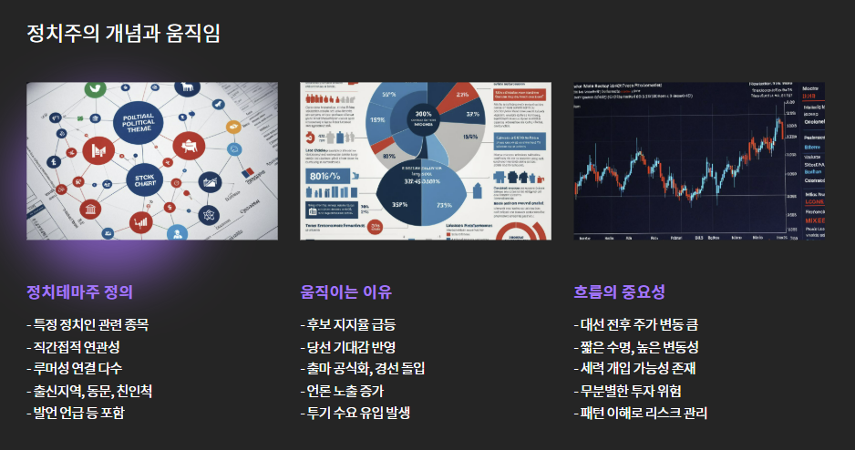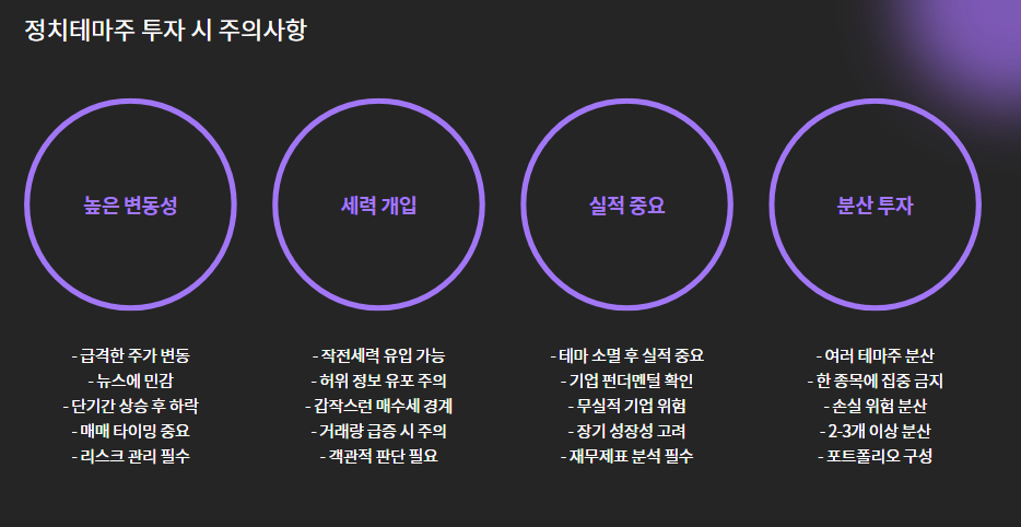 하지만 정치테마주는 짧은 수명, 높은 변동성, 세력 개입 가능성으로 인해