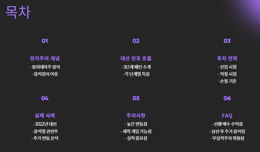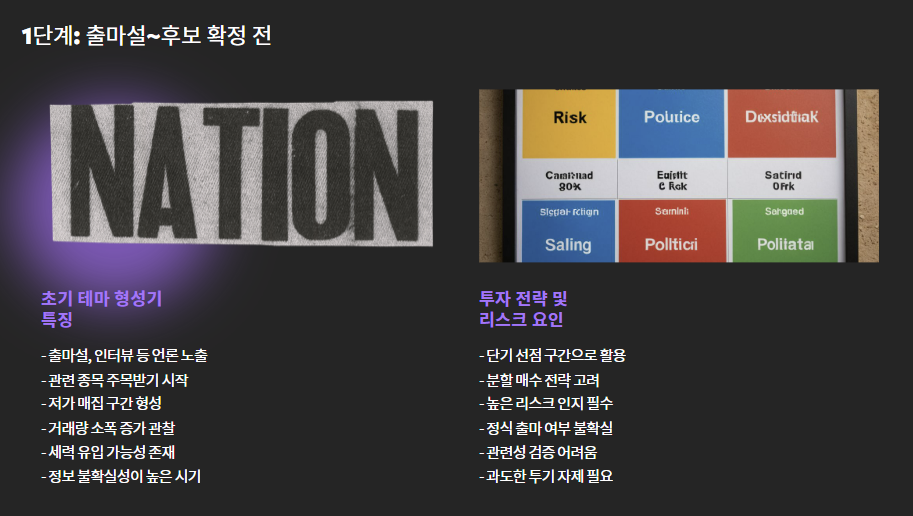 | 출마설, 인터뷰, 언론 노출 | 후보로 떠오르기 시작하면 해당 정치인 관련 종목 주목 |