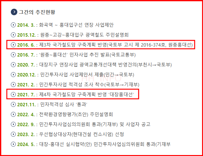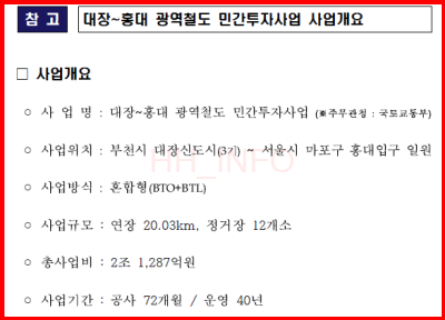 대장홍대선은 원래 원종홍대선으로, 원종역에서 홍대까지 이어지는 노선이었어요. 그러나 정부에서 3기 신도시를 발표하면서 대장지구까지 연장하는 것을 부천시에서 건의했고, 21년 제4차 국가철도망 구축계획 때 대장-홍대로 변경됐답니다. 노선도 중간중간 많이 바뀌면서 혼란이 있었지만, 최종 현대건설 컨소시엄과 실시협약을 맺으면서 이제 노선은 확정되었어요.