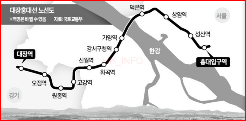 대장홍대선 노선도는 대장~홍대입구역까지 총 12개 역이에요. 이 중 환승역은 총 5개입니다. (GTX D 예정까지 포함해서)