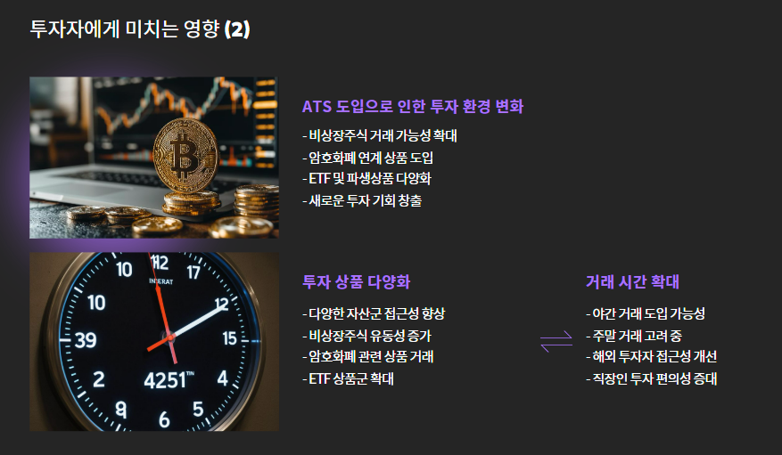 - ATS를 통해 비상장주식, 암호화폐 연계 상품 등 거래 가능성