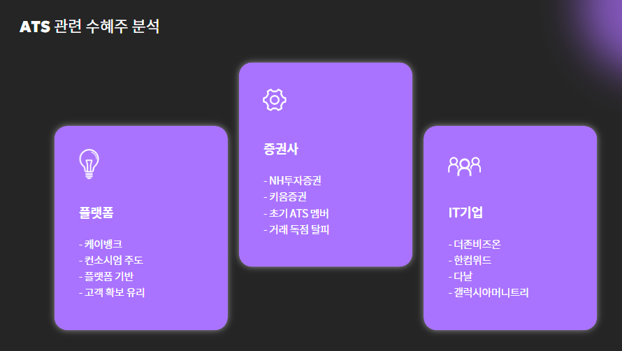 | NH투자증권, 키움증권 | 초기 ATS 설립 멤버, 거래 독점 탈피 수혜 |